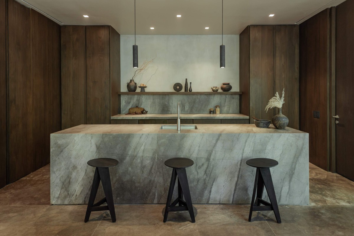 High-end finishes include natural stone and marble floors, custom hardwood carpentry, polished cement and artisanal stone walls, and triple-pane sliding windows for superior insulation and comfort. The studio also features central air conditioning via a mini chiller system, providing efficient cooling without visible AC units.