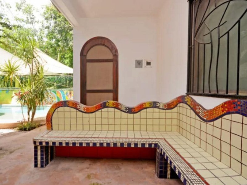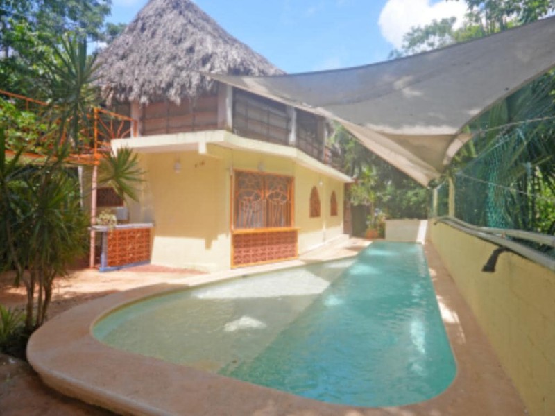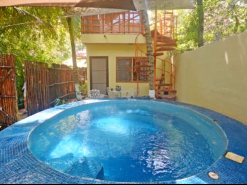 Entertainment is taken to the next level with a refreshing pool, inviting jacuzzi, and a cozy palapa, perfect for hosting gatherings and creating lasting memories. The lush green area adds a touch of nature, creating a serene oasis within the property.